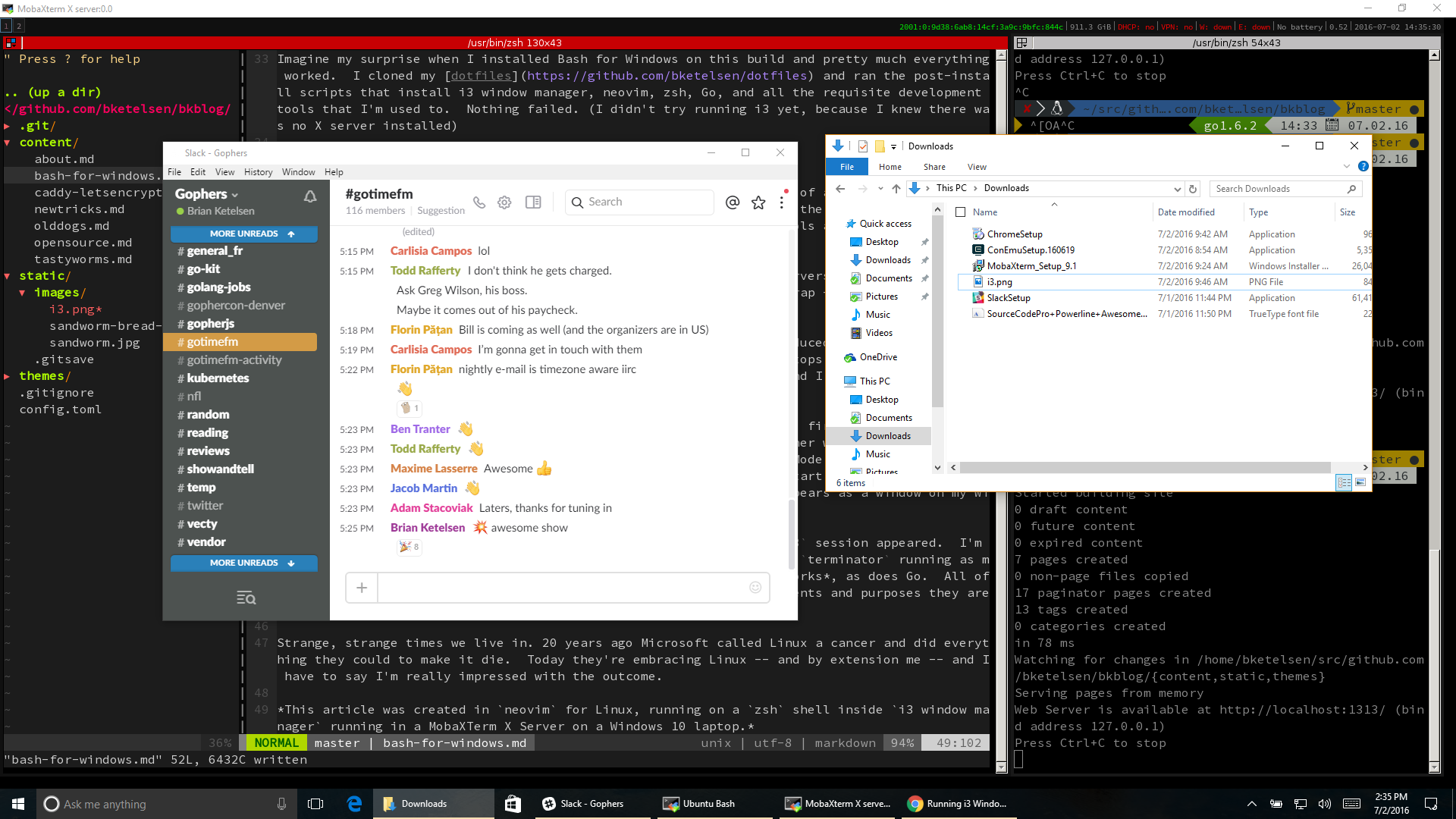 Imagine my surprise when I installed Bash for Windows on this build and pretty much everything worked. I cloned my dotfiles and ran the post-install scripts that install i3 window manager, neovim, zsh, Go, and all the requisite development tools that I'm used to. Nothing failed. (I didn't try running i3 yet, because I knew there was no X server installed)